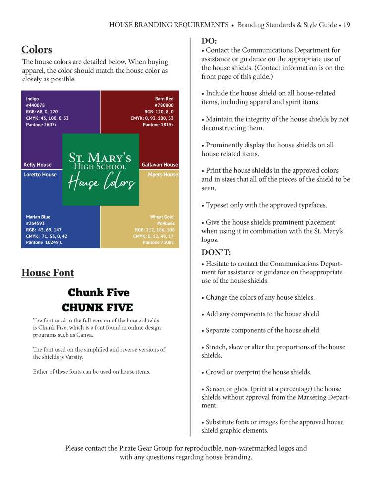 Using pieces that are on brand is an important aspect of communications and marketing. During my years at St. Mary’s High School, I worked with a committee and outside vendor on a rebrand. Once the brand was updated, I created a full branding standards manual to ensure the proper use of the logos. When the school moved to a house system, I worked helped develop the brand for each house and worked with a contract graphic designer in the creating logos for each house.
